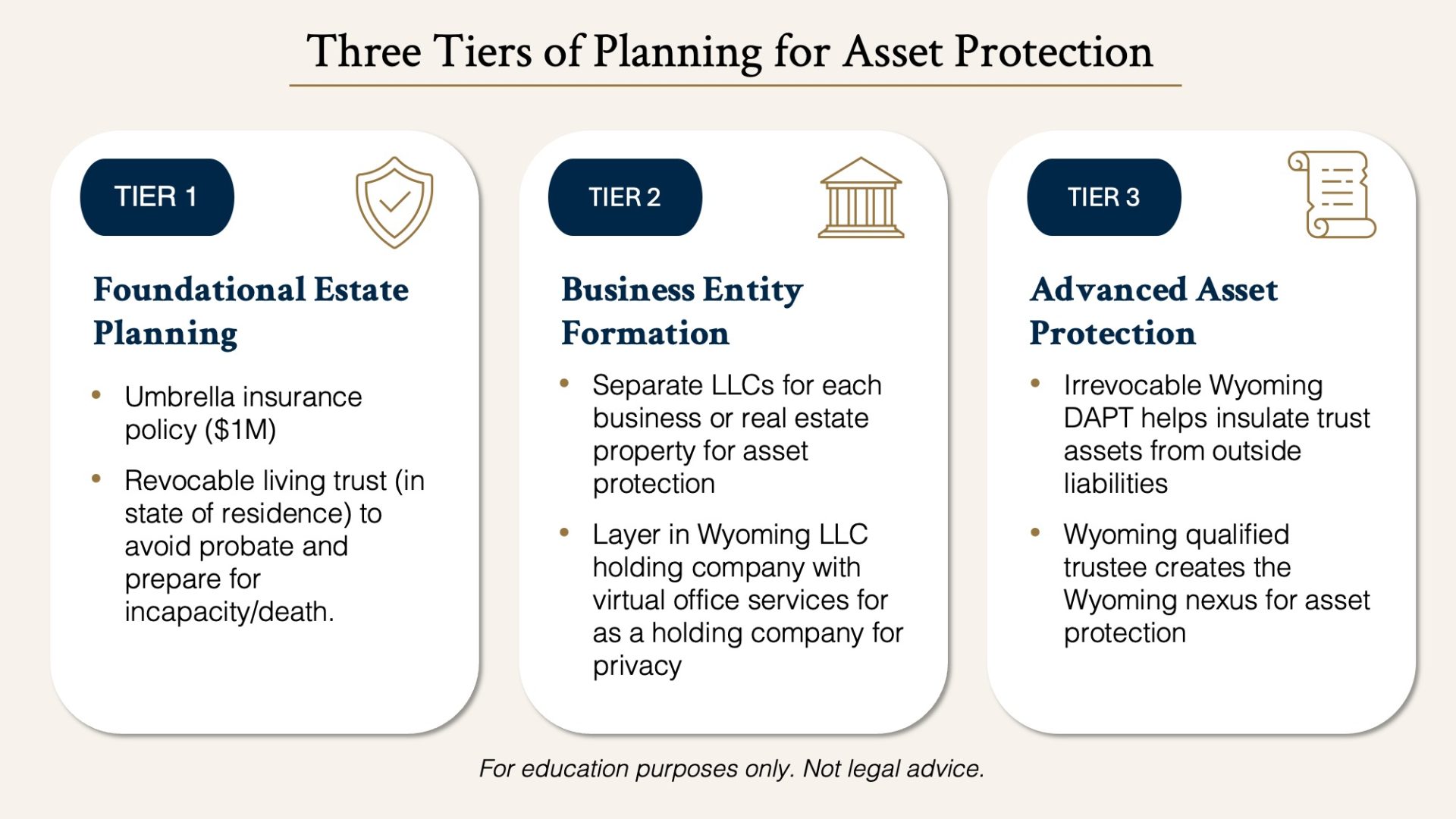 Many people are worried about liability either through accidents or fraudulent lawsuits and are looking for a legal strategy to protect their assets. The best solution is highly relative to the situation of each individual. While there’s no one-size-fits-all solution, asset protection generally falls into three tiers. Each tier builds on the previous one, offering increasing levels of protection, complexity, and planning benefits.